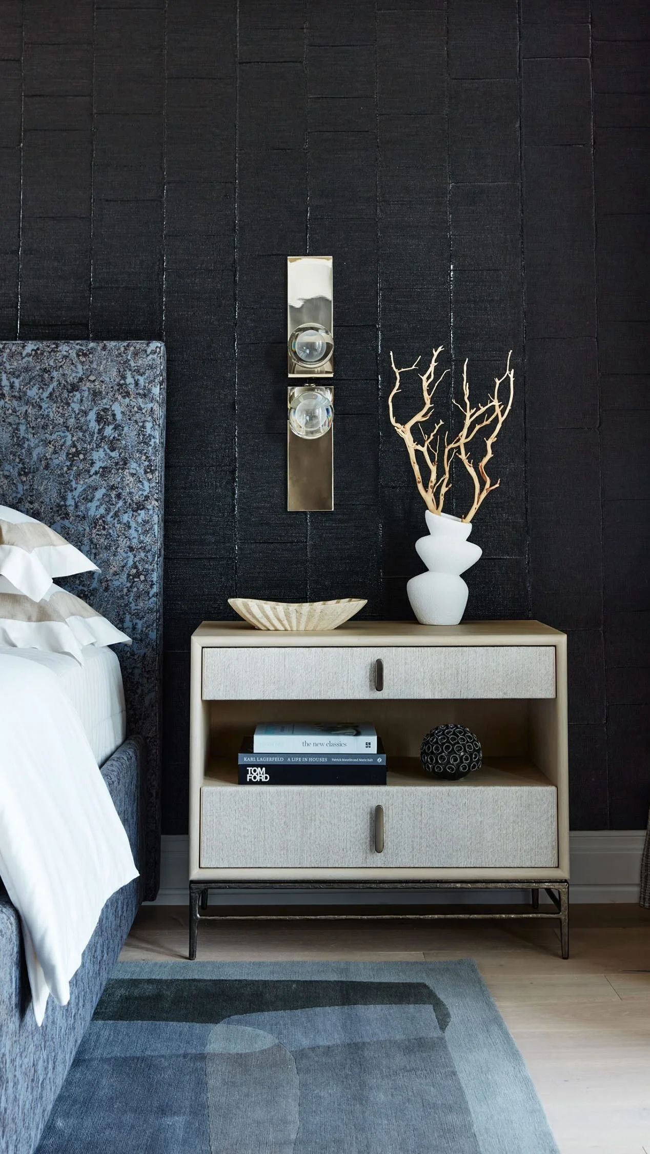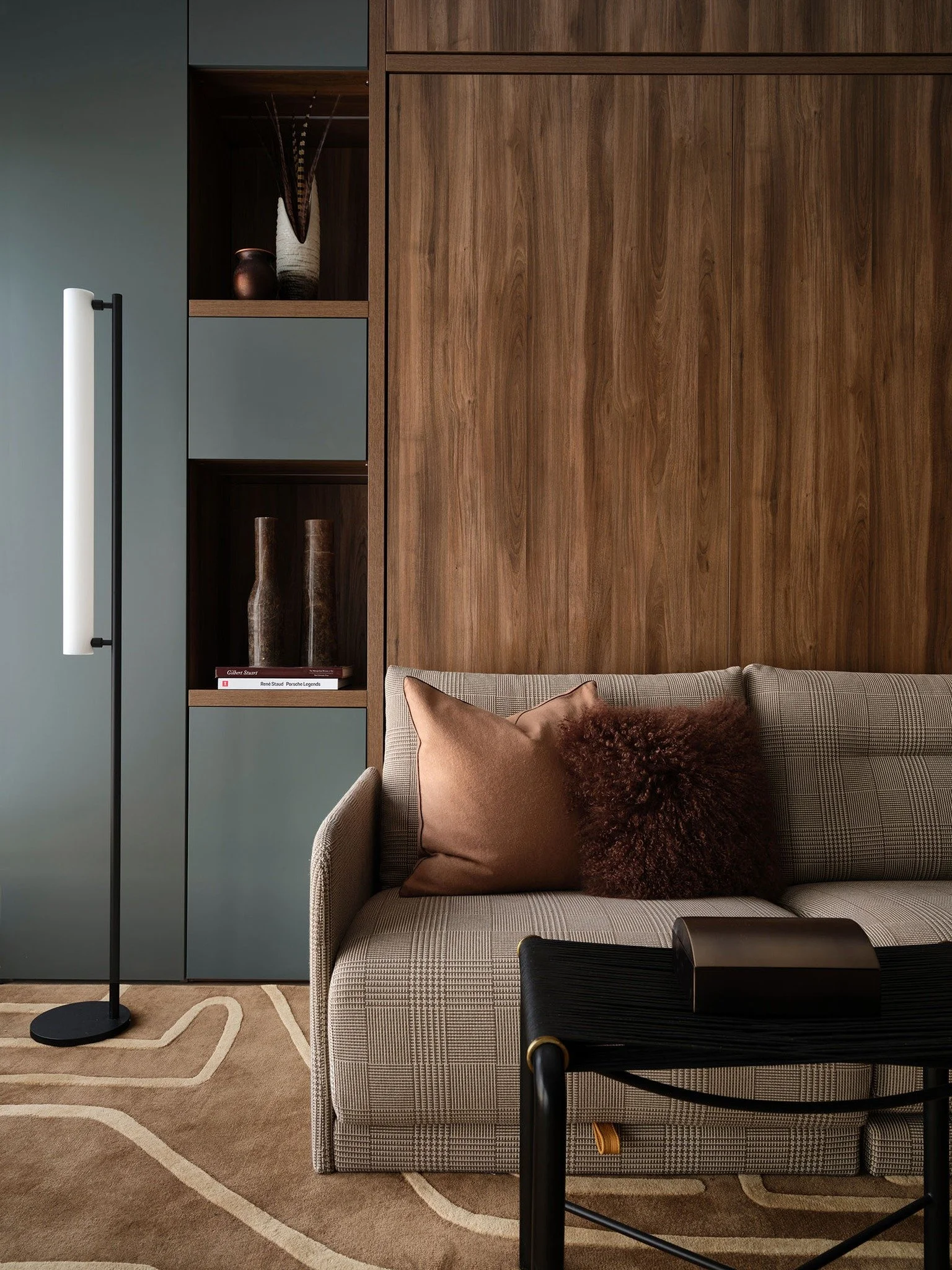 Nautical Noir is an oceanfront retreat that showcases dramatic and unexpected materials that elevate seaside living. A bold and moody materials palette and rich walnut woods are paired with sleek modern forms that create a sophisticated and comfortable space.
