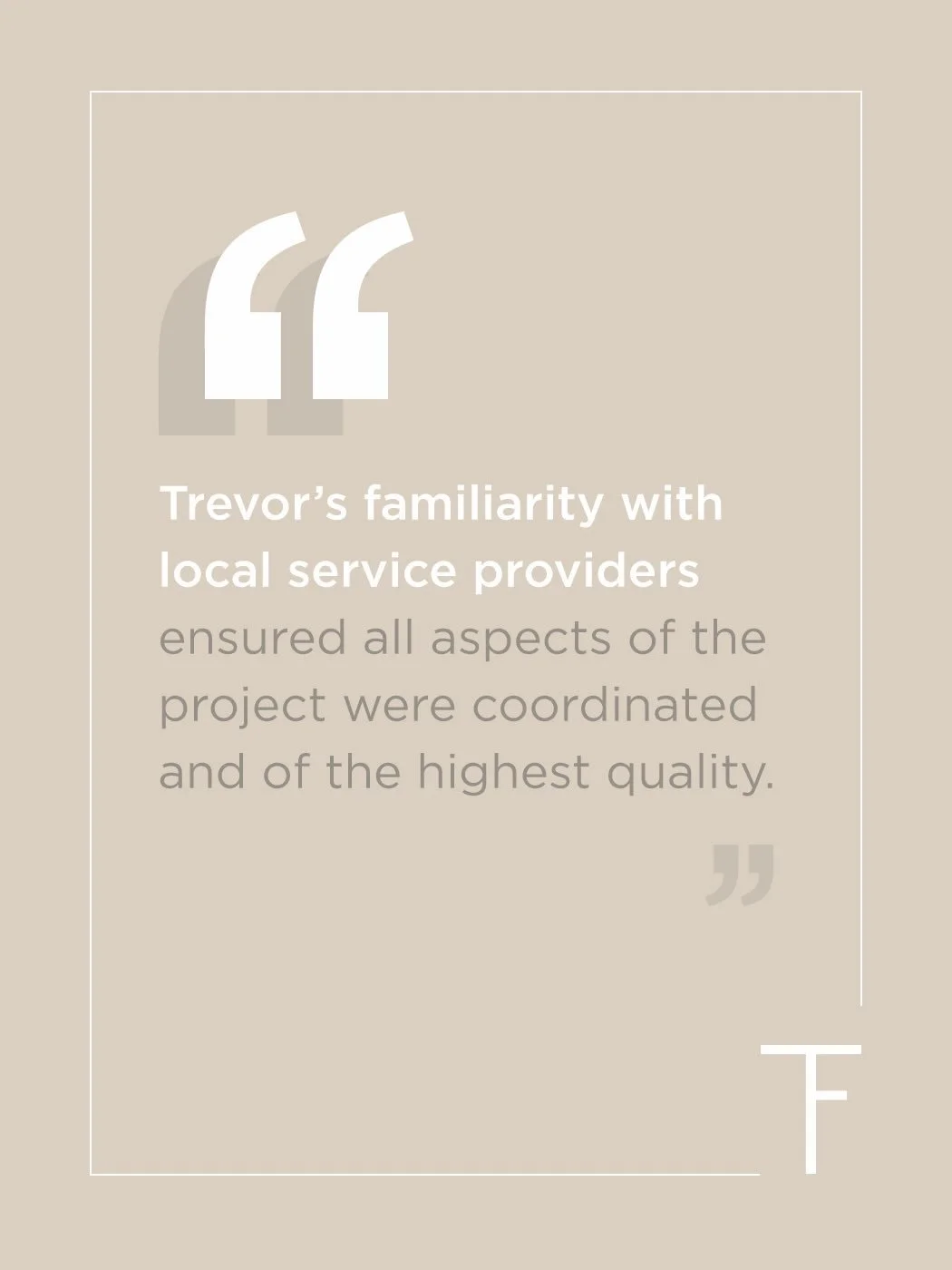 Committed to a collaboration, Trevor's design process is rooted in building trust, fostering lasting relationships, and consistently exceeding client expectations. He takes pride in partnering with clients to solve their unique design challenges, ensuring their authentic selves are reflected in every space. As a dedicated relationship builder, Trevor is proud to call many of his clients friends.