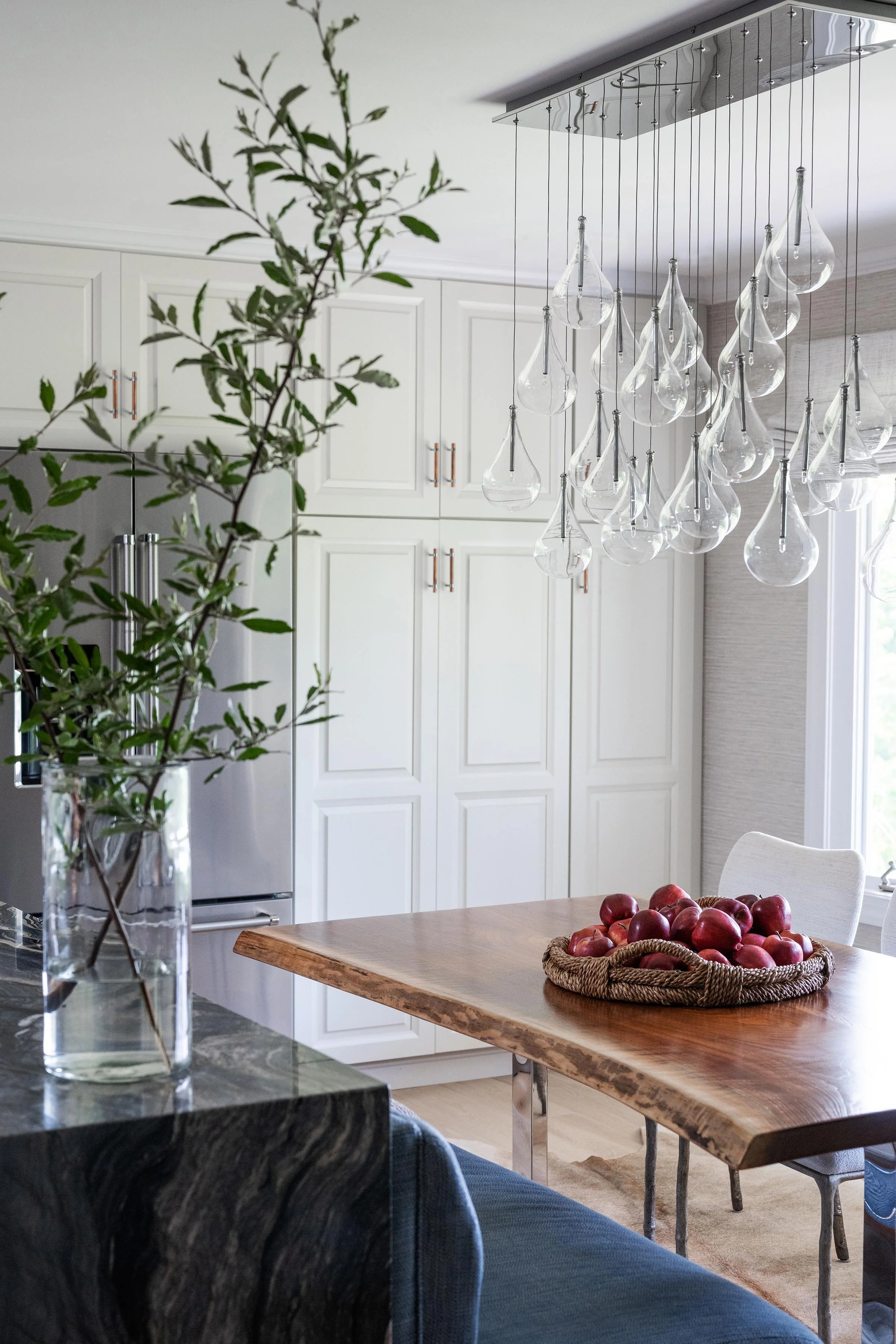 Contemporary, expansive, and multi-functional, this extensive kitchen renovation modernized an original 1993 design. The gut remodel introduced a seamless, open floor plan featuring two large islands, perfect for both functionality and style. The perimeter is lined with ample storage, while carefully layered, creative lighting enhances the space's atmosphere. Contrasting white and walnut cabinets, paired with an oversized copper hood, create a striking focal point, beautifully complemented by a herringbone backsplash and a custom live-edge table. This kitchen renovation effortlessly blends modern design with timeless elegance, making it both practical and visually beautifully.