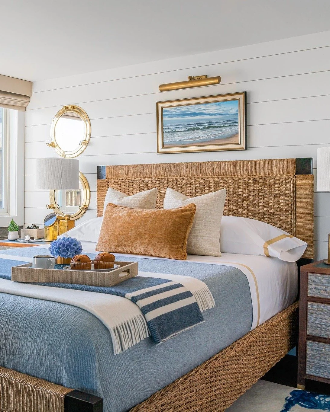 Natural textures and coastal interior design finishes, such as seagrass and woven furniture, beautifully complement contemporary lighting and sculptural décor. Expansive windows invite abundant natural light, balancing the black and earth-tone color palette. Thoughtfully selected textural patterns, metallic finishes, curated artwork, and vintage pieces enhance this coastal contemporary interior design, resulting in a home that feels both elevated and inviting, perfect for beachside living.